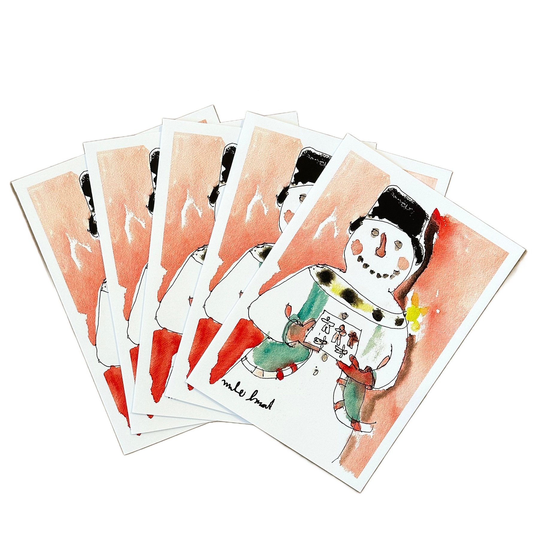 A pack of 5 blank gift cards with reproduction of original snowman drawing by studio artist, Mike Smart. Cards are printed on medium weight paper and sold with individual envelopes.